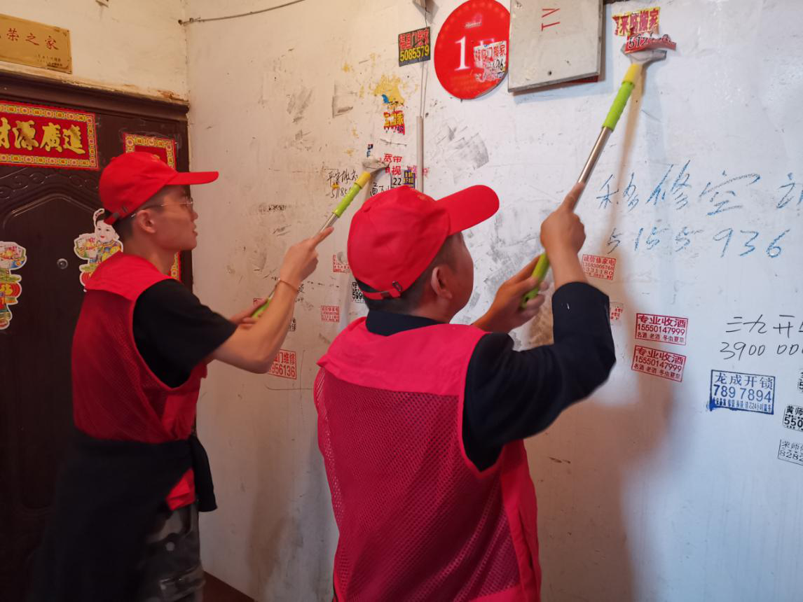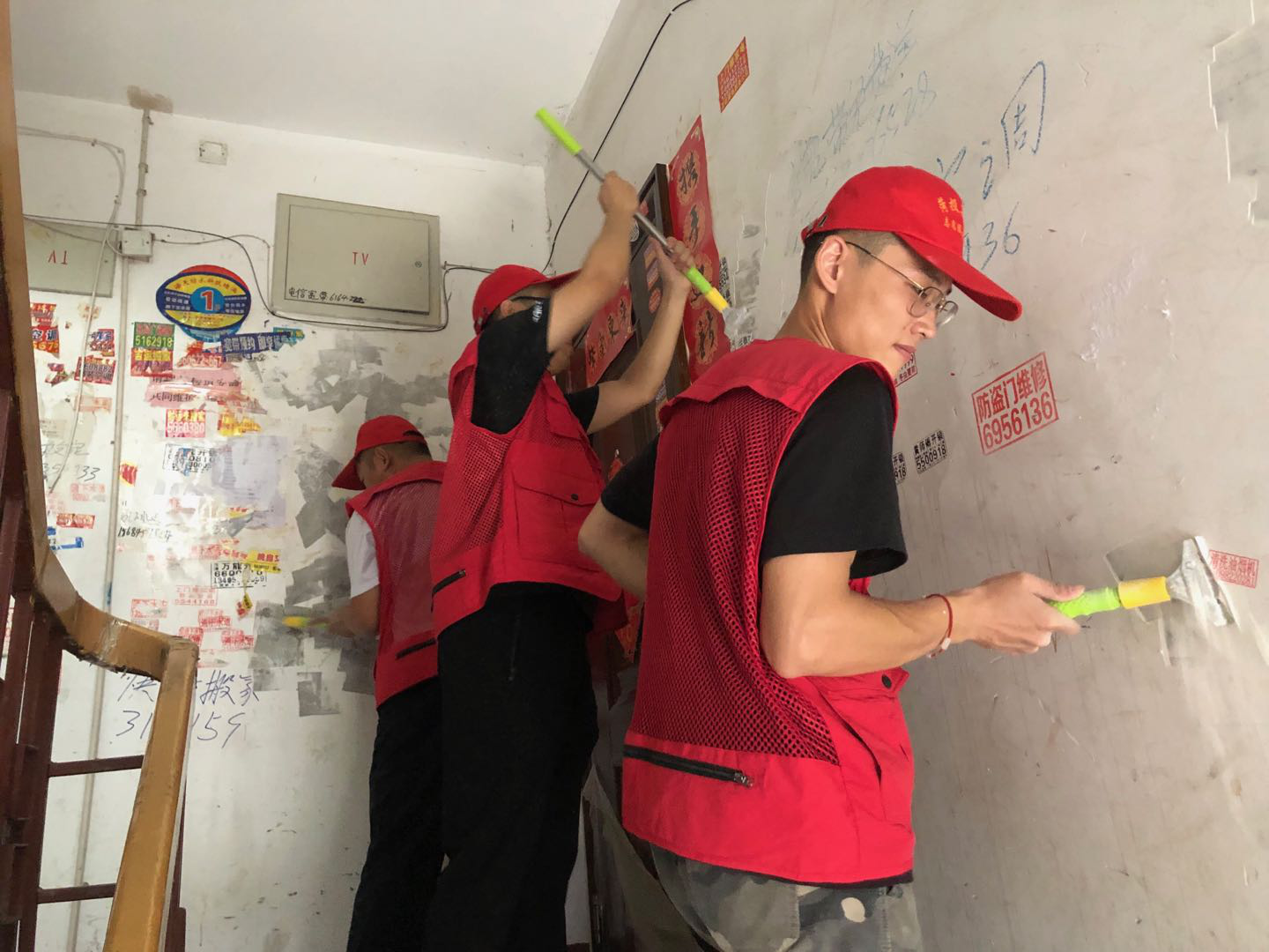 菏投集團(tuán)志愿者們仔細(xì)鏟除小區(qū)內(nèi)墻面上的小廣告