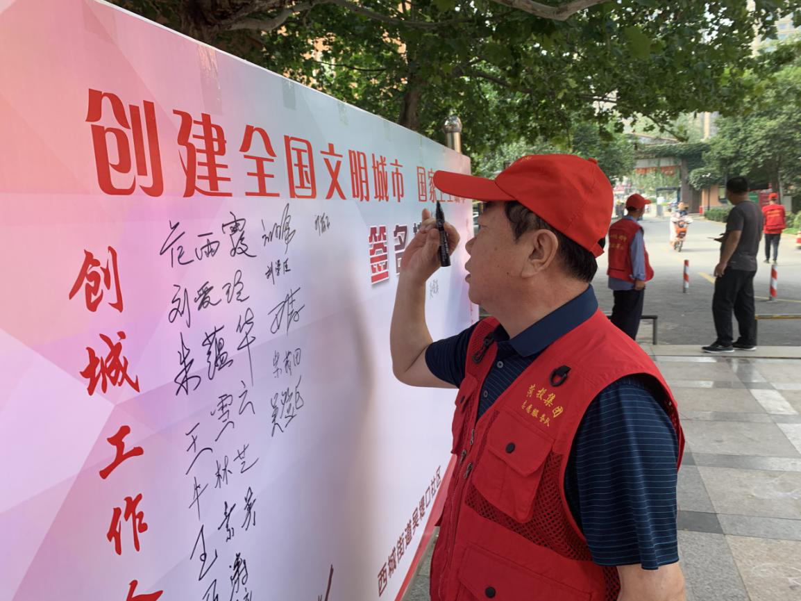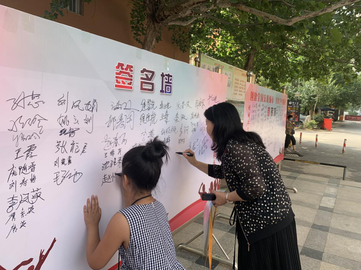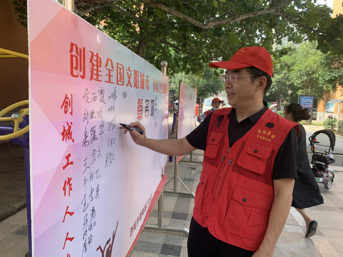 活動現場設置“創(chuàng)建全國文明城市和國家衛(wèi)生城市”主題的簽名墻。居民紛紛在簽名墻上寫下姓名,鄭重承諾為爭做文明市民做表率,以實際行動傳遞心聲,助力創(chuàng)城攻堅。