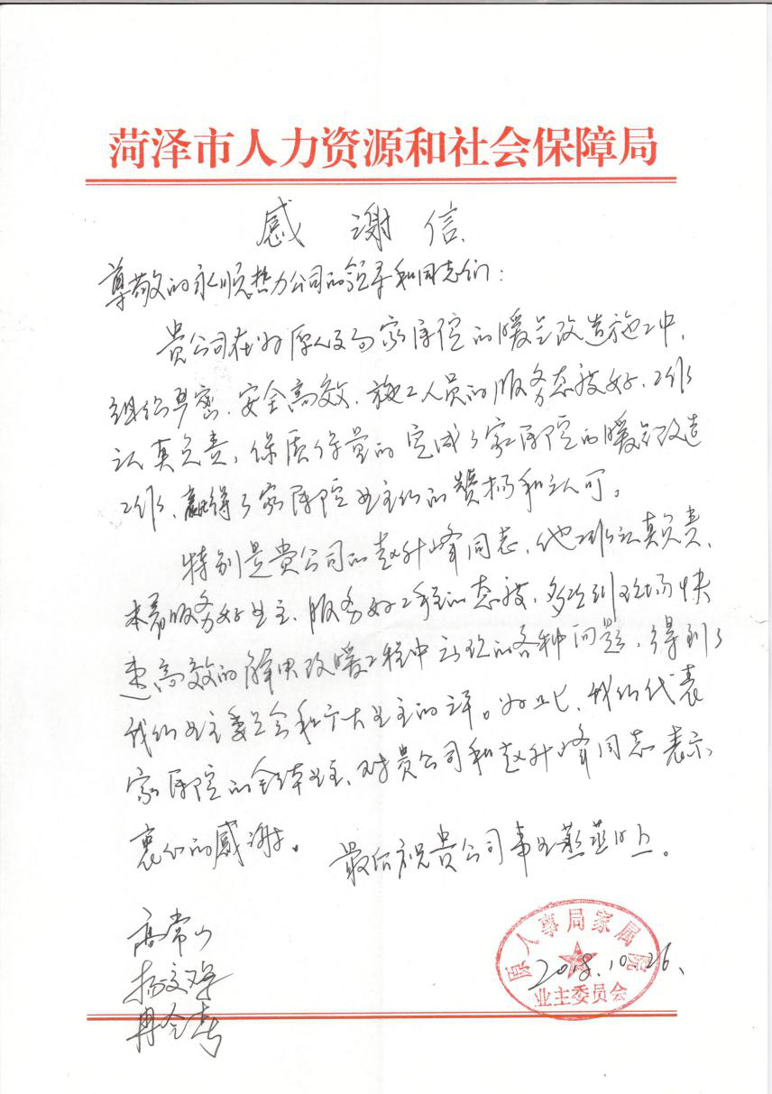 10月30日,永順工程公司收到原人事局家屬院業(yè)主的感謝信,對永順工程公司在人社局家屬院暖氣改造施工中認真負責的工作作風、熱情周到的工作態(tài)度表示滿意和贊揚。