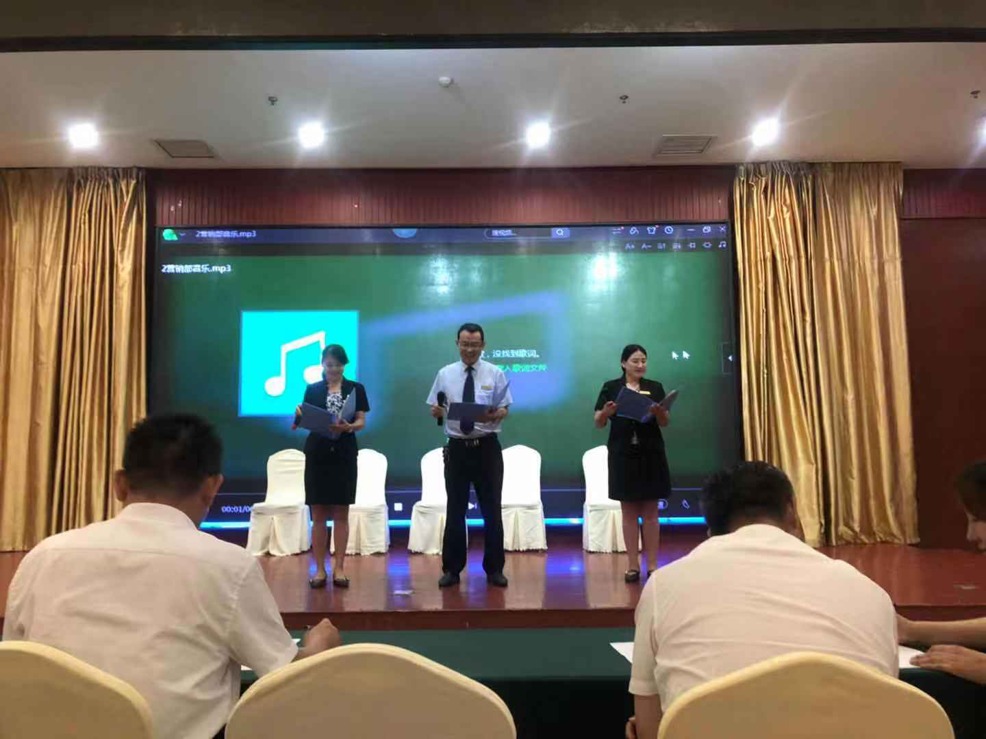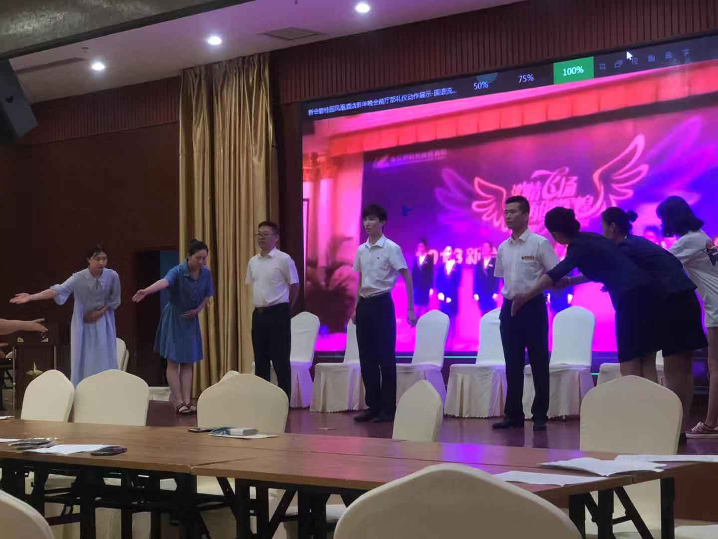 酒店八個(gè)部門精心準(zhǔn)備了節(jié)目,有紅歌聯(lián)唱、詩朗誦、小合唱、禮儀表演等節(jié)目,八個(gè)部門都一一上臺(tái)演出。經(jīng)過精心的篩選,決定出《為有犧牲多壯志》、《中華頌》、《我驕傲,我是中國(guó)人》三個(gè)詩朗誦節(jié)目,小合唱歌曲《在希望的田野上》,《文明禮贊?禮儀表演》五個(gè)節(jié)目參加公司選拔。